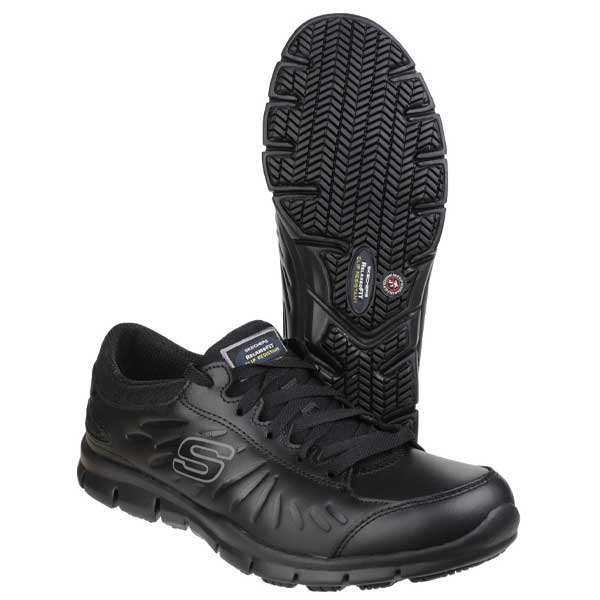 Sporty style meets surefooted comfort in the SKECHERS Work Relaxed Fit Eldred SR shoe. Smooth leather upper in a lace up sporty casual work slip resistant sneaker with stitching accents and Memory Foam insole.