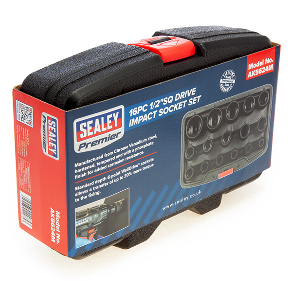 The Sealey AK5624M is a 16 Piece Impact Socket Set in metric sizes from 10mm to 32mm with a 1/2 inch square drive.